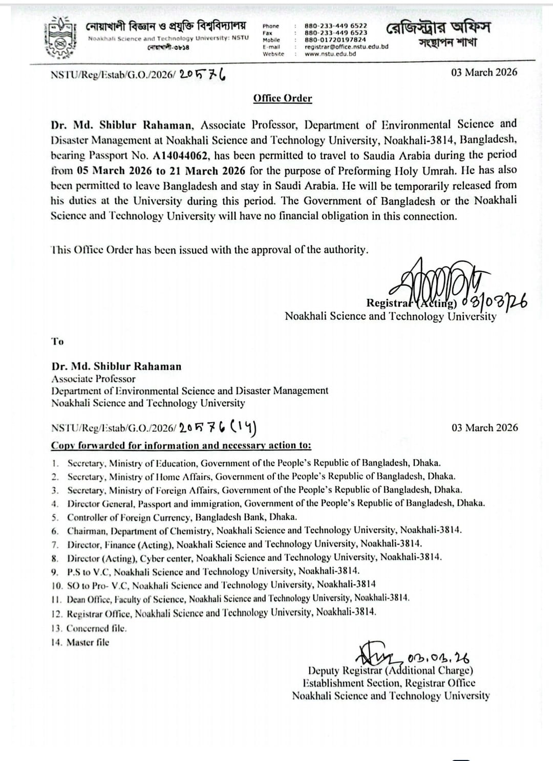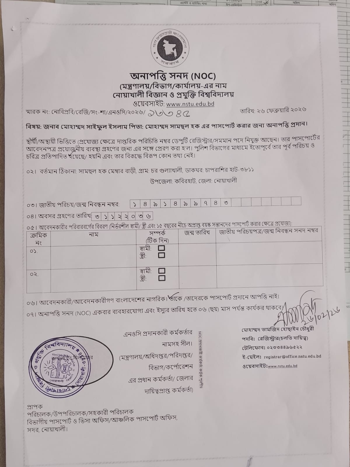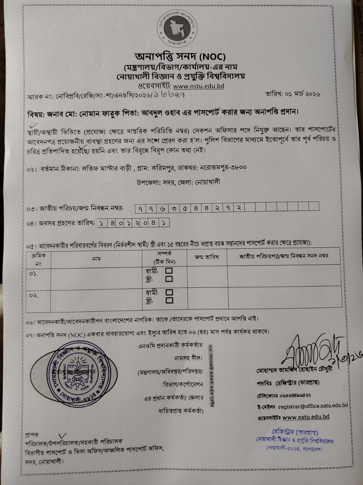 | Md. Noman Faruk | Section Officer | Registrar Office, NSTU | 01/03/2026 |