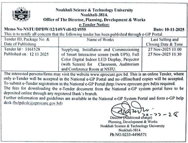 | Supply Installation testing and Commissioning of Smart Interactive Screen(with UPS), Full Color Digital Indoor LED Display, Projector (with screen) for classroom, auditorium and conference room at NSTU. | 12/11/2025 |